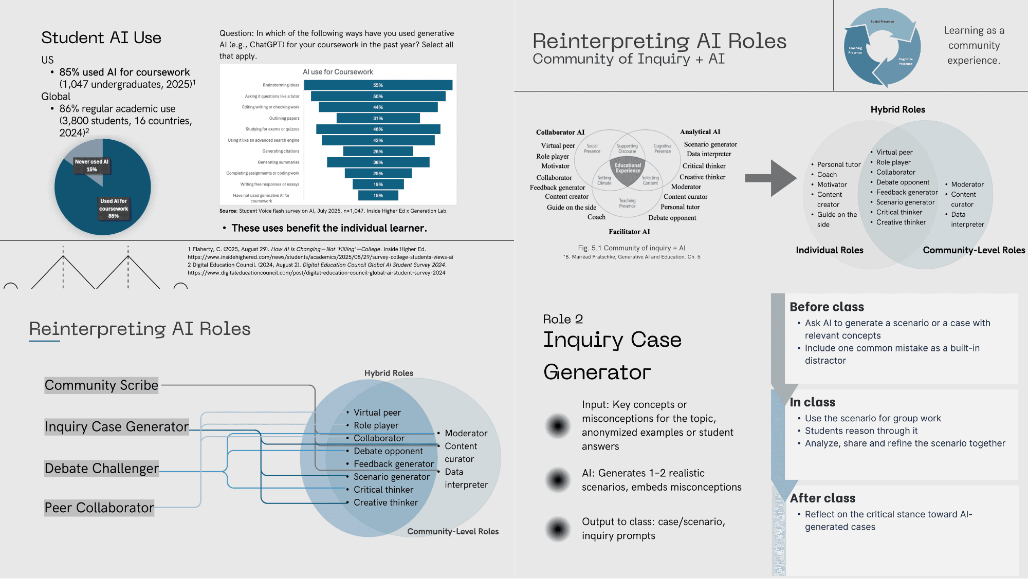 Designed a conceptual framework for class-level AI use in higher education. Instead of focusing on AI as an individual study tool, this project reinterpreted AI as a support for collective learning and proposed four class-facing roles: Community Scribe, Inquiry Case Generator, Debate Challenger, and Peer Collaborator. The framework draws on Community of Inquiry and recent research on AI, engagement, and collaborative learning.